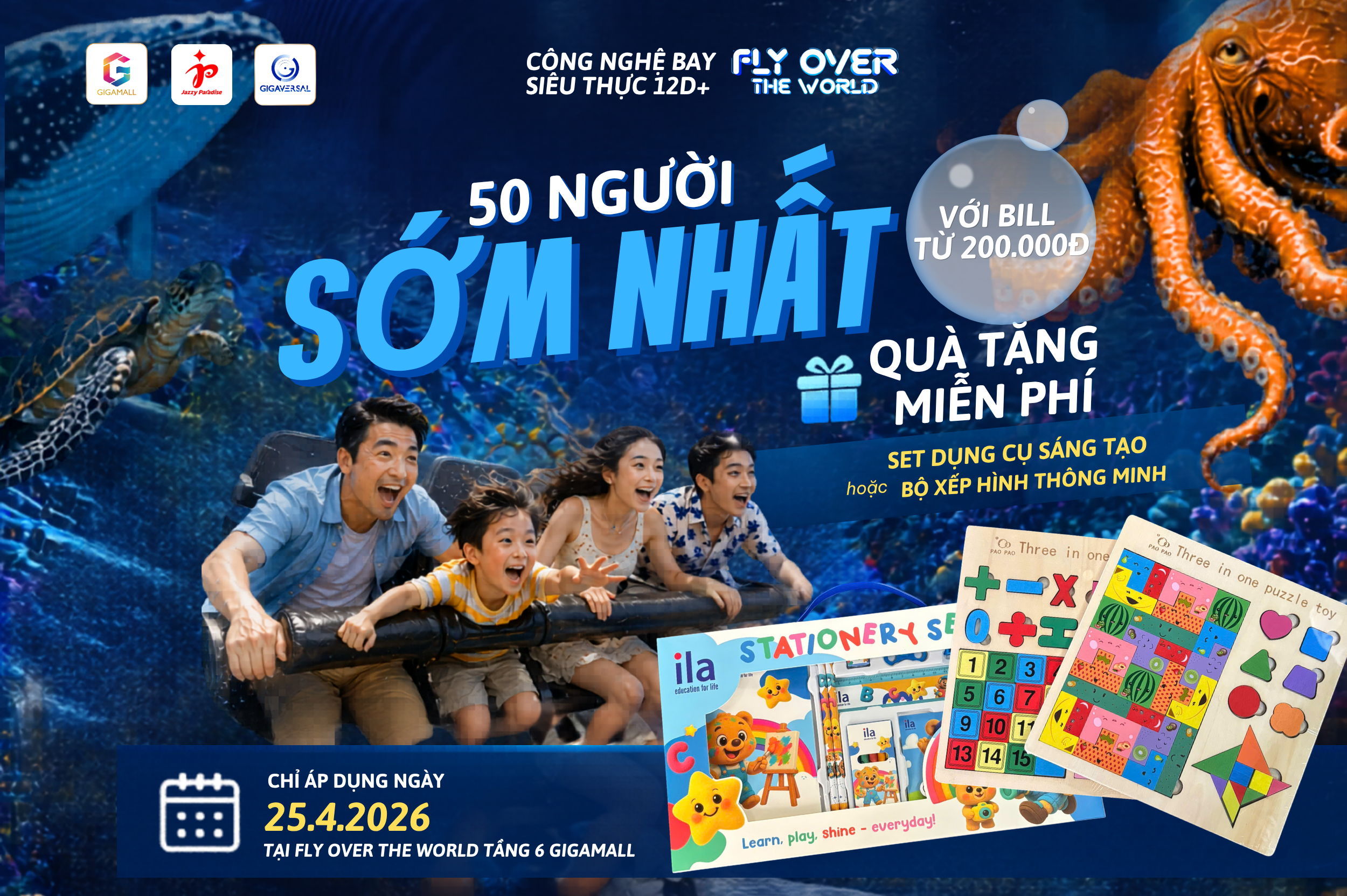 Sau thành công vang dội của các hành trình bay xuyên lục địa, công nghệ bay siêu thực 12D+ đầu tiên tại TP. Hồ Chí Minh, Fly Over The World tại tầng 6 Gigamall chính thức ra mắt phiên bản mới: Fly Over The Underwater World vào ngày 25/04/2026. Đây là bước tiến đột phá trong việc chinh phục giác quan của giới mộ điệu cảm giác mạnh, hứa hẹn tạo nên một làn sóng trải nghiệm mới lạ giữa trung tâm thành phố.