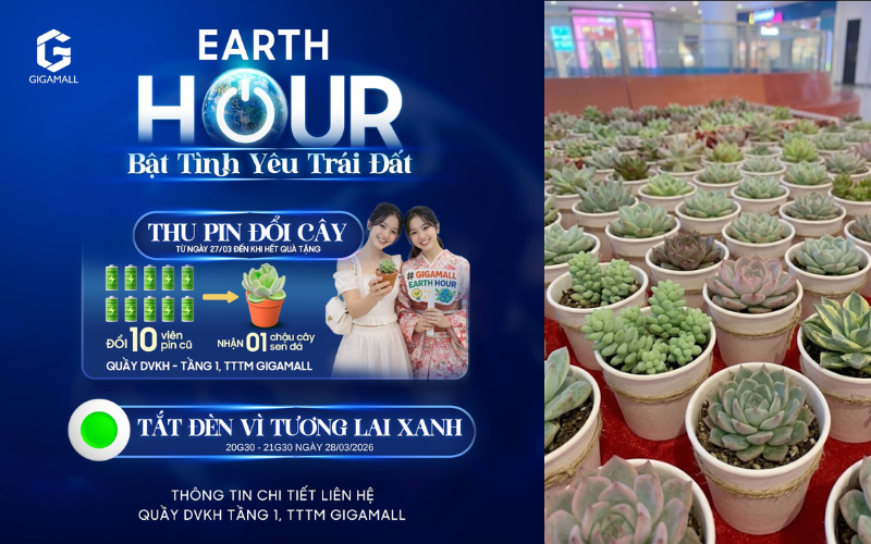 Nhờ sự kết hợp nhuần nhuyễn giữa công nghệ hiện đại và quy trình quản lý chặt chẽ, mỗi tháng Gigamall tiết kiệm được từ hàng trăm nghìn kWh điện. Con số này tương đương với việc cắt giảm chi phí vận hành, minh chứng cho hiệu quả của mô hình TTTM thông minh – bền vững. Giờ Trái Đất 2026 tại Gigamall là lời mời gọi mỗi chúng ta hãy cùng nhau thay đổi từ những thói quen nhỏ nhất. Hãy cùng gia đình đến Gigamall cuối tuần này để vừa vui chơi khám phá lễ hội, vừa chung tay kiến tạo một tương lai xanh hơn. Chương trình "Thu pin cũ – Nhận sen đá" bắt đầu từ ngày 27/03/2026 tại Quầy Dịch vụ khách hàng (Tầng 1). Sự kiện tắt đèn hệ thống chiếu sáng diễn ra từ 20:30 – 21:30 ngày 28/03/2026.