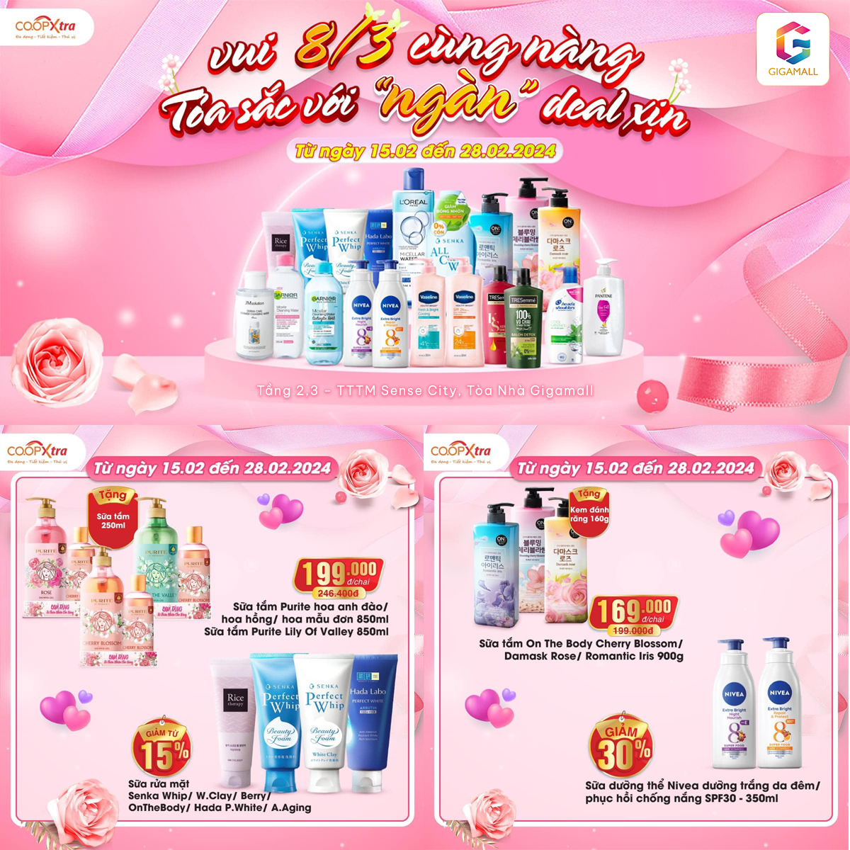 - Sữa tắm On The Body Cherry Blossom/ Damask Rose/ Romantic Iris 900g, giá gốc 199.000đ/chai, giảm còn 169.000đ/chai và tặng kem đánh răng 160g.