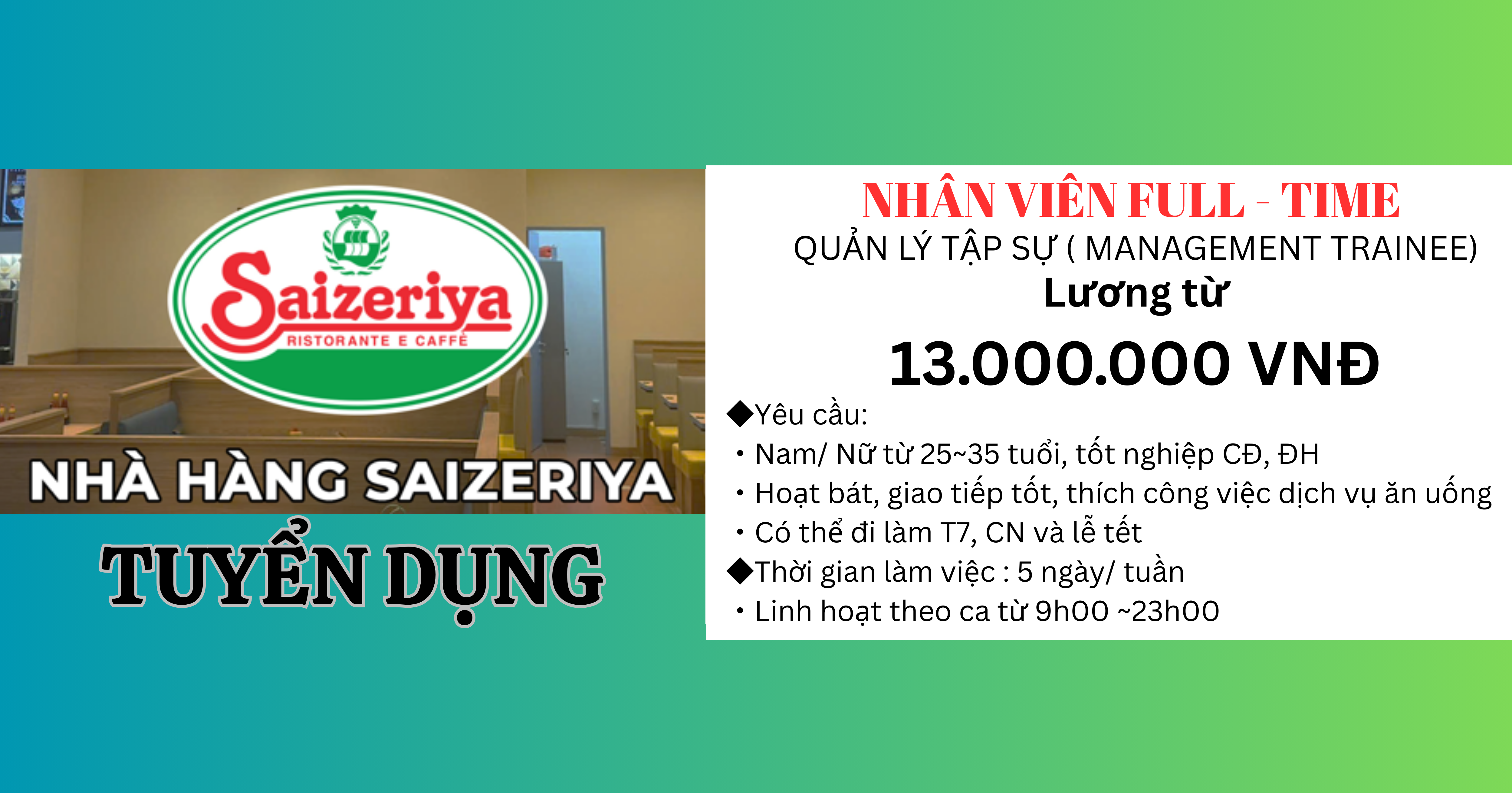 Ngày đăng: 18.03.2026Được đào tạo theo chương trình Saizeriya Management Trainee là vị trí đào tạo quản lý tương lai cho chuỗi nhà hàng Saizeriya.